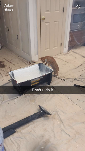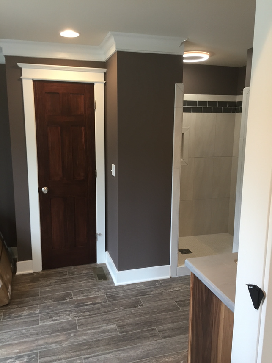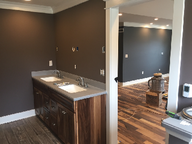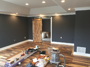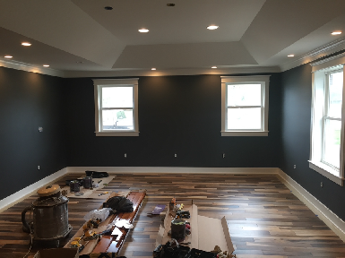 We gave this space a bold, modern transformation with deep, rich wall colors paired against clean white trim and ceilings for sharp contrast. The detailed lighting and finish work tie everything together, creating a high-end, polished look throughout the room. Even through the process, it’s clear this project came together with precision, personality, and a strong attention to detail. And our little friend chipped in to help as well.